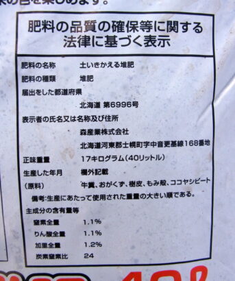 上の写真は、堆肥の入っているビニール袋の裏面右下に記載されている内容