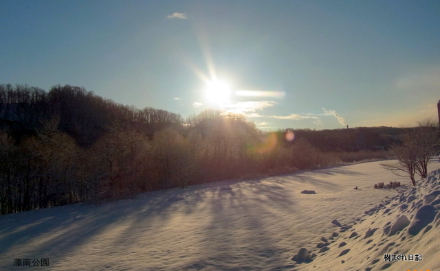 しかし、次の日、2日、朝日を撮りに藻南公園に行ってきました。 1月上旬、1年で最も日の出の遅い時期、朝8時の低い太陽から射す光が長い影をつくり、それと相まって、明方に降った雪が樹木の細い枝先まで積もる樹姿は、雪化粧した清々しい景色をより一層引き立てます。