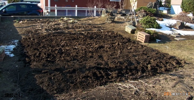 早速、畑起こしです。剣先スコップに足をかけて、土にぐぅっぐぅっと30~40cm差し込みます。それをひっくり返します。天地返しほど深くは掘り返せないですが、そのような気持ちで掘り起こしています。気温が低いためか、土を掘り返したときに漂ってくる土の香りをかげないのが少し残念です。雪が解けたばかりで、まだ土は水分を含んでいて重く、20~30分も作業を続けると腰にきます。 それでも、これからの種まき、発芽、苗の生長を楽しみに精を出します。
