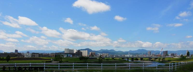 北13条大橋から南西方面を撮影。中央右側豊平川に架かる橋は上白石橋。ビル群は札幌市中心部。中央白いビルの上に見える山は藻岩山。写真右側の高い山は手稲山。