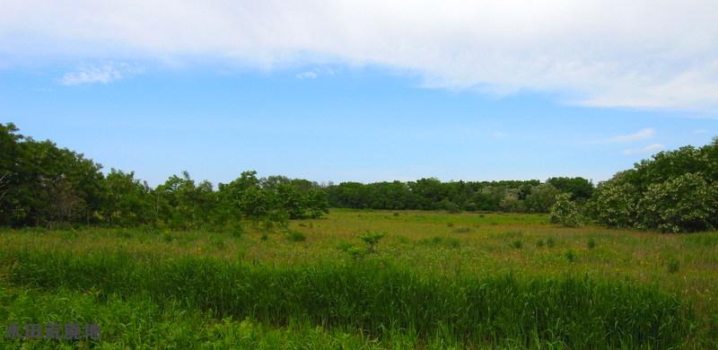 中央を横断している樹木群は防風林。幅は50m以上。鉄道防風林はヨーロッパトウヒなどの針葉樹が多いが、低湿地帯ではヤチダモが主体。