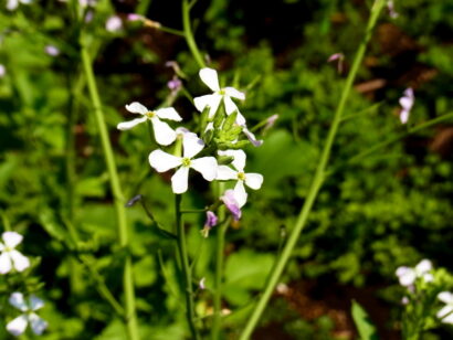 1~2年草本で花茎は60~100cmくらい、長だ円形のがく片と、卵形の花弁がそれぞれ4枚の、典型的なアブラナ科(十字科)の花です。花色は白、まれに黄色や紫混じりのものもあります。