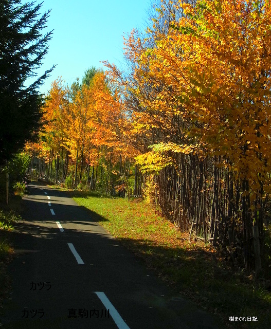 このサイクリングロードは春先から秋口まで頻繁に行き来する道なのですが、今までカツラの甘い香りに出会ったことはなかったのです。 ところが、今年の10月19日10時頃の晴れた朝に、突然、それは襲ってきました。 鼻腔をくすぐる程度の香りではなく、百合が原公園で剪定直後の生垣から発散していた甘い匂いと同じくらいの強さのものでした。