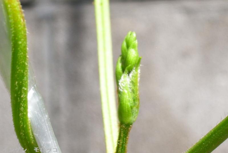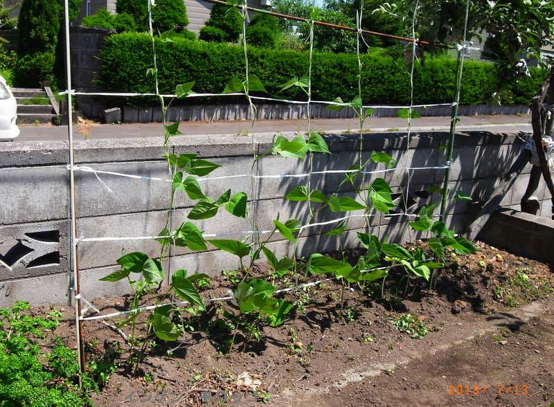 6月11日:は種。7月4日にツルが伸び出してきたので紐を張る。各葉の基部に花をつける。写真は蕾