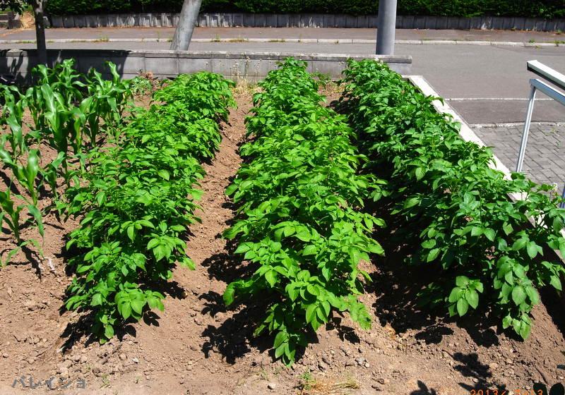 5月15日に種いも植付け。6月上旬:土から芽出し。6月18日と7月上旬に計2回培土(土寄せ)。6月下旬頃から開花 花は出てきたものから順次除去。