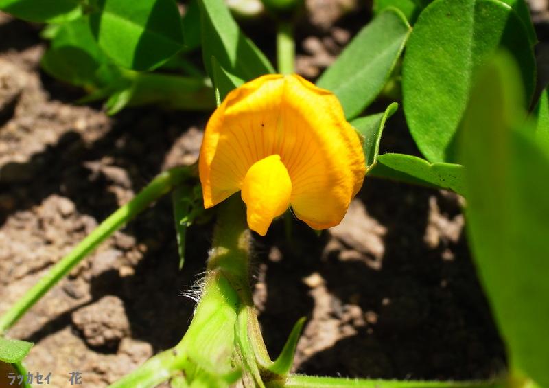 5月21日:は種 マメ科植物なので、ニセアカシアやフジなどと同じ葉形。地面を這うように成長。他の野菜類に比べて成長が遅い。右側の写真はラッカセイの花。