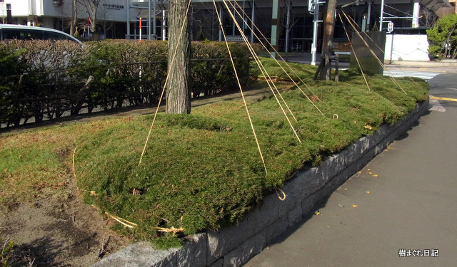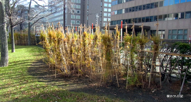 北5条西5丁目 紀伊国屋書店前の冬囲い。 竹棚の下は、ツジ類とツルニチニチソウ
