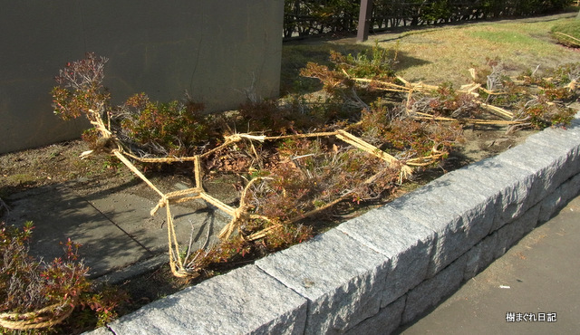 写真上はドウダンツツジ、下はサツキ。 この冬囲いは何というのでしょうか。 縄締め? この方法でも雪の重みから樹木を守っている?和らげている? のですね。