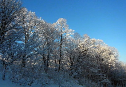 まだ陽が出たばかりの低い太陽光線に細い枝の先まで雪をまとった樹木が映えます。  光と影。 雲一つない空。 今冬初めての新鮮な雪景色。