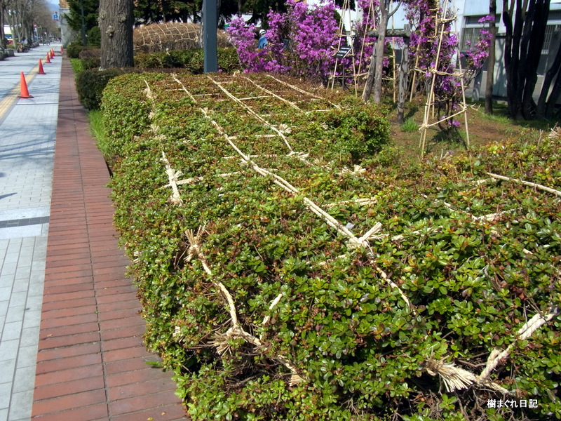北5条西5丁目 紀伊国屋書店前の冬囲い。 竹棚の下は、ツジ類とツルニチニチソウ