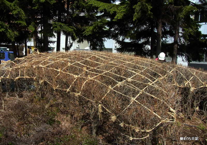 写真上はドウダンツツジ、下はサツキ。 この冬囲いは何というのでしょうか。 縄締め? この方法でも雪の重みから樹木を守っている?和らげている? のですね。