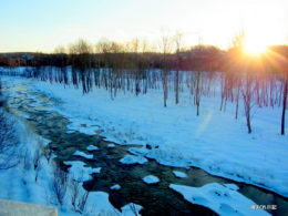 1月30日午前7時30分。 豊平川と川筋に沿って生えている冬枯れの樹林。 その向こうに広がる低い山並。 空は快晴に近く、ほんの少し赤みを帯びた低い空から太陽が顔を覗かせています。