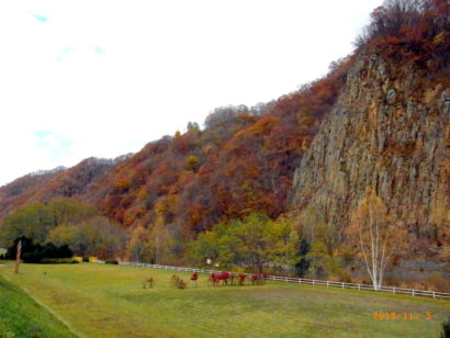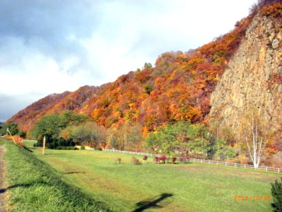 10月中旬になると、紅黄葉しだす樹木が現れる。 写真手前の黒い塊はモンタナ