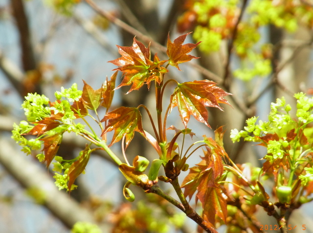 写真は、アカイタヤとイタヤカエデの開花と新葉です。