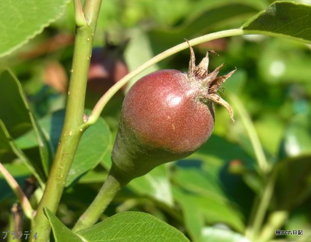 7月初め頃は、まだ小さな実(3~4cm)です。ヨーロッパから移入された西洋なしの代表的な品種、バートレットやブランディワインもこのような赤色をしています。もっと赤味が濃いように記憶しています。その後ブランディの果皮は黄緑に変わりますが、バートレットとブランディワインは赤味を帯びたまま大きくなります。
