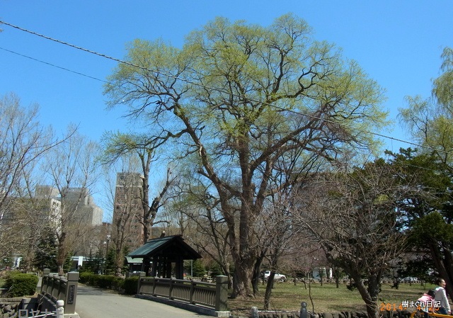 左側にエゾヤマザクラが開花しています。その右横はカツラ、その右横の新芽(新緑)が吹いている樹は、ドロノキ。シロヤナギの右横の樹はイタヤカエデのようです。